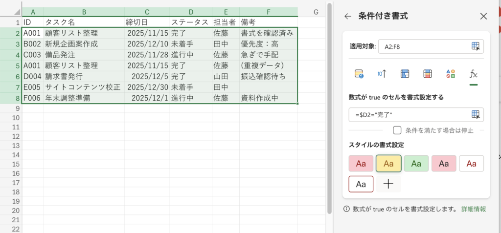 - 例1: 「ステータス」が「完了」だったら、その行全体に色を付けたい