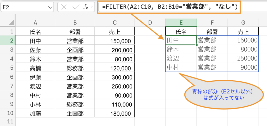 FILTER関数の面白いところは、1つのセルに数式を入れるだけで、結果が複数のセルに「溢れ出して(スピル)」表示される点です。