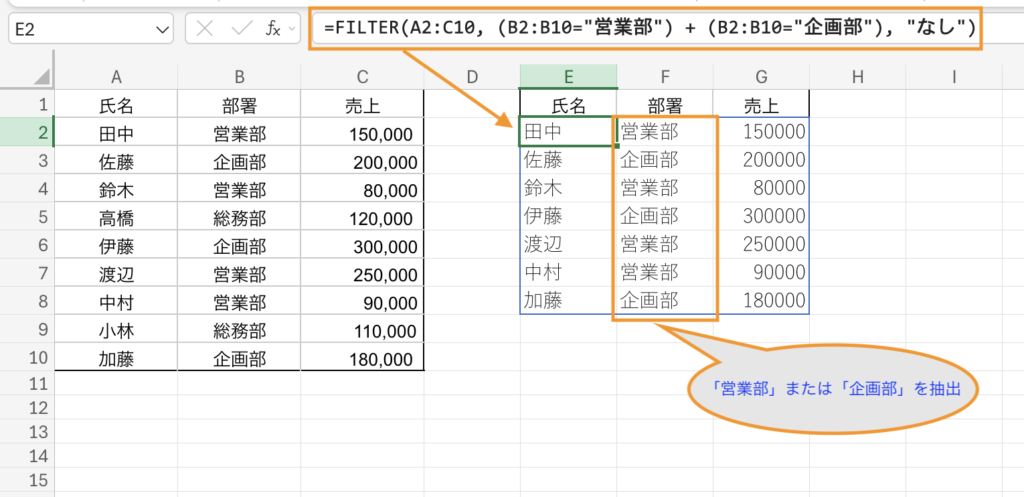 =FILTER(A2:C10, (B2:B10="営業部") + (B2:B10="企画部"), "なし")