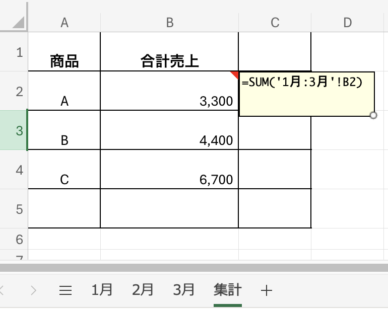 👉 1月シートから3月シートまでのB2をまとめて計算します。シートを追加しても、範囲の中にあれば自動的に集計対象になります。