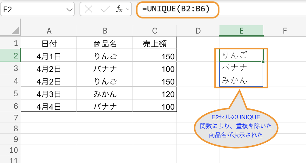 指定した範囲から重複を除いた項目だけが、自動的に並んで表示されます。