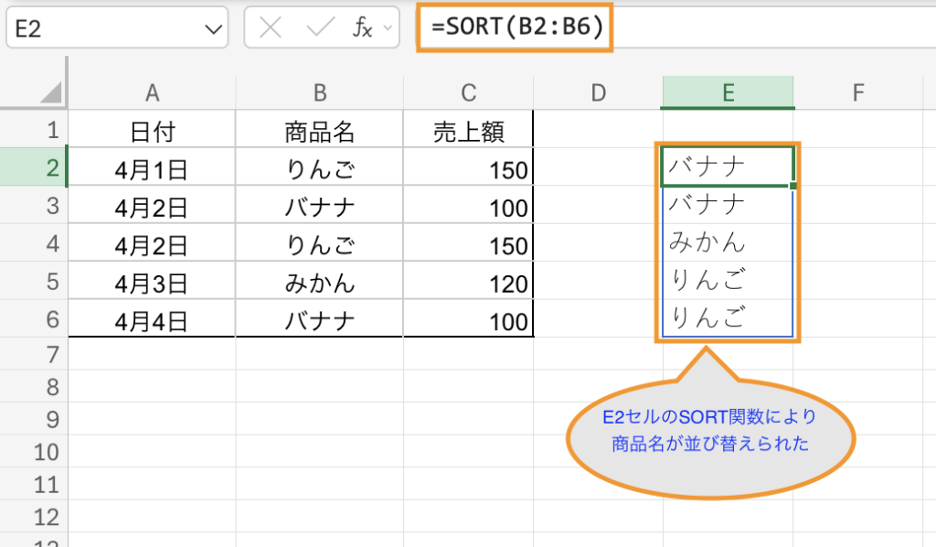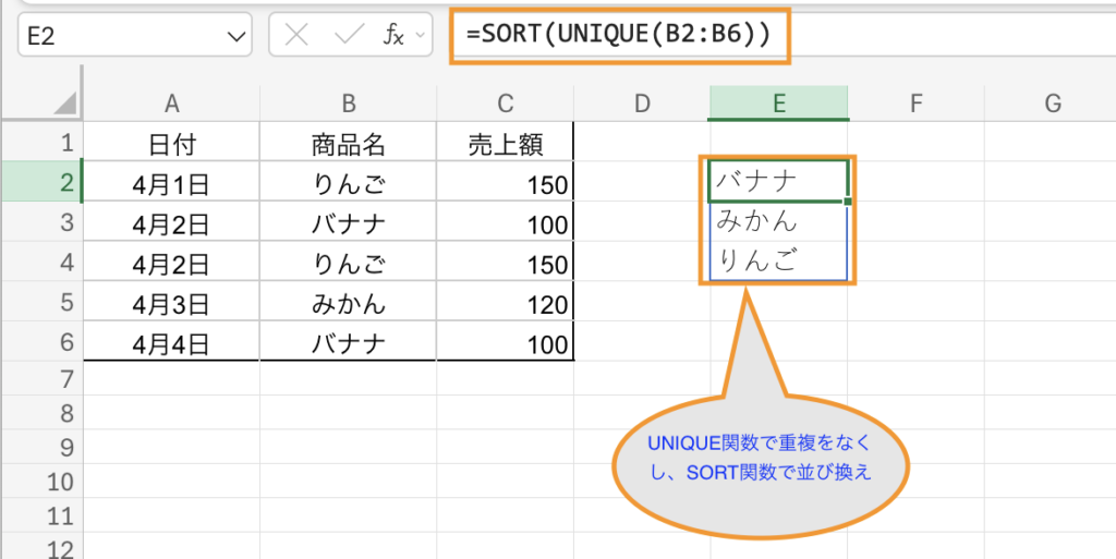 セルE3に次のように入力します。 =SORT(UNIQUE(B3:B100))